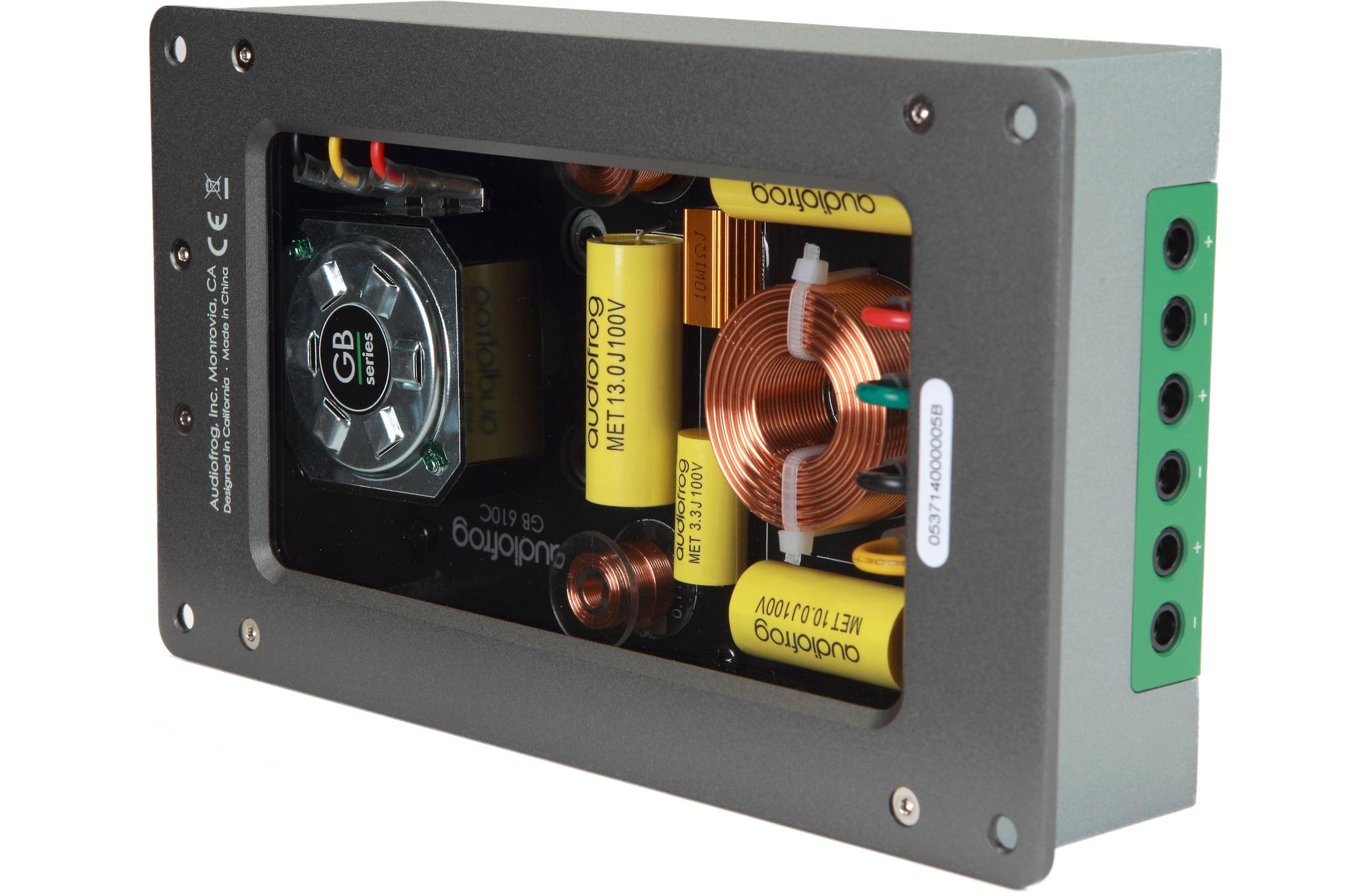 Audiofrog built the GB615C 2-way passive crossover network specifically for use with the GB60 6-3/4" midrange driver and the GB15 1-1/2" tweeter, sending the correct frequencies to each driver for a full dimensional sound. The GB615C uses the optimum crossover point (2200 Hz) for these two speakers, and is specially designed for minimum frequency response deviation.