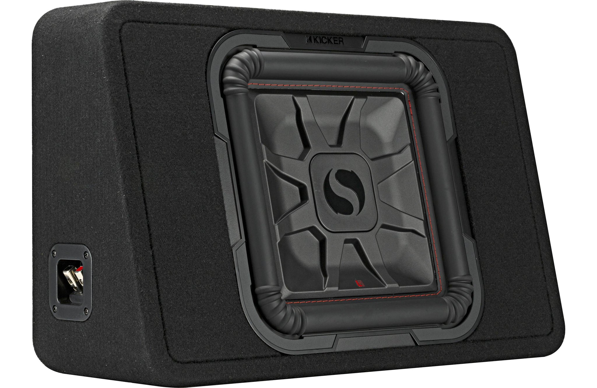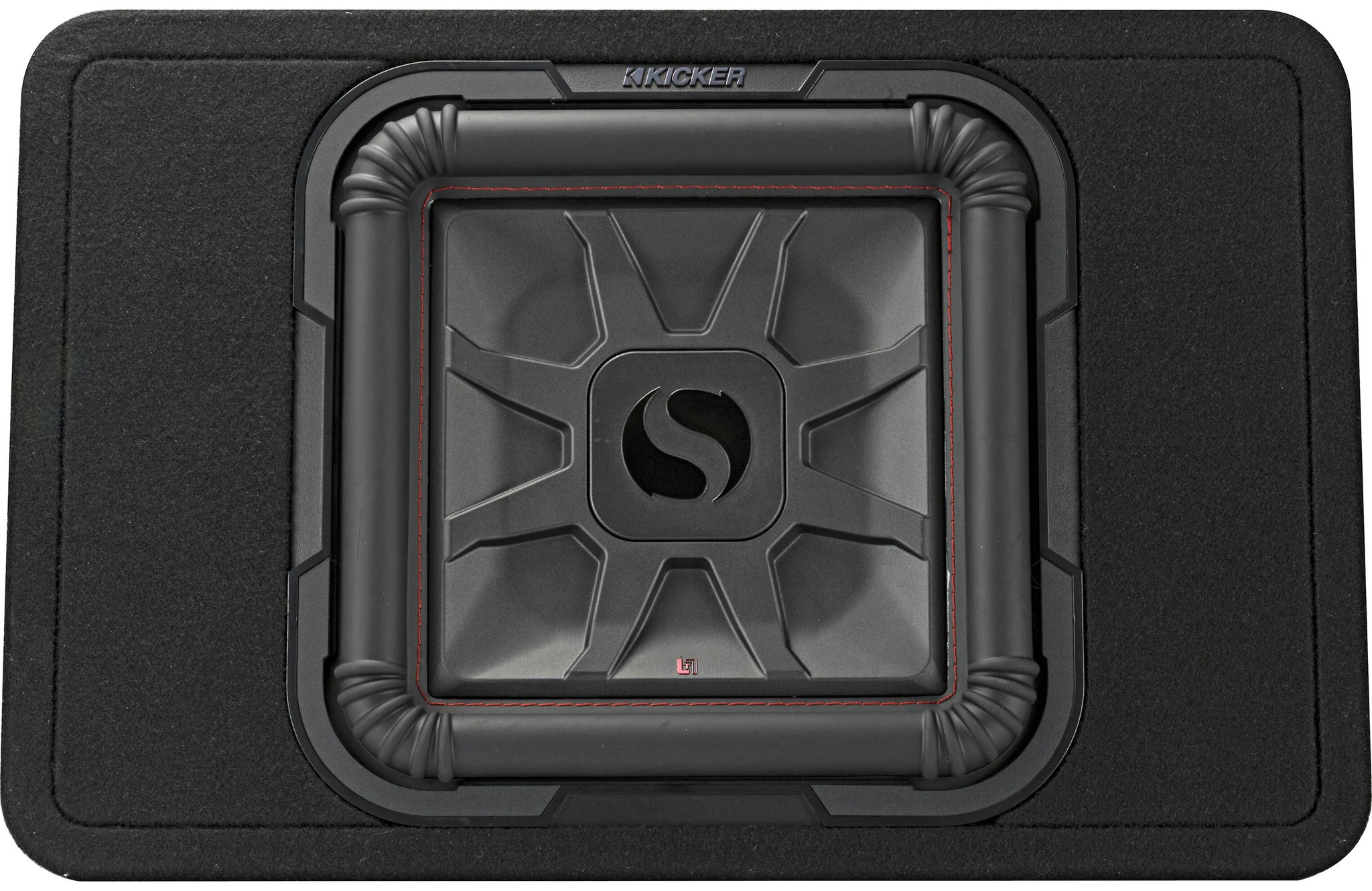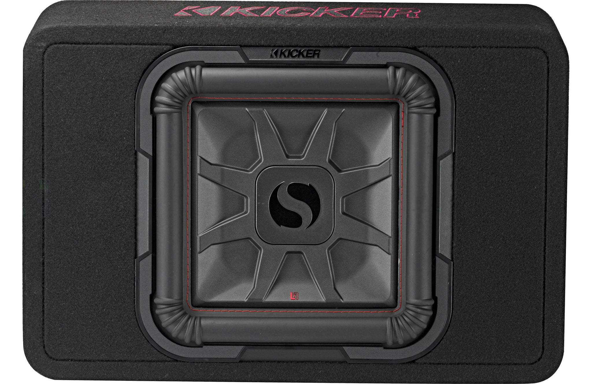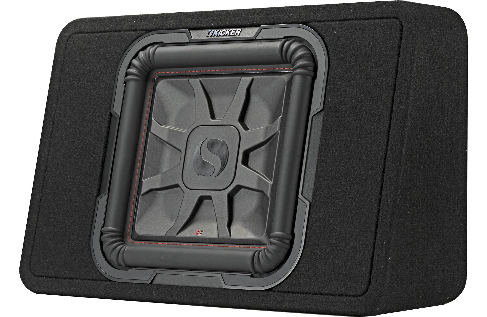 Kicker's TL7T122 loaded enclosure brings the spectacular performance of their unique L7 square subwoofer design to smaller spaces than ever before. At only 7-3/4" deep, this box gives you the punch and high power-handling of a 12" speaker in a package that fits behind many truck seats.